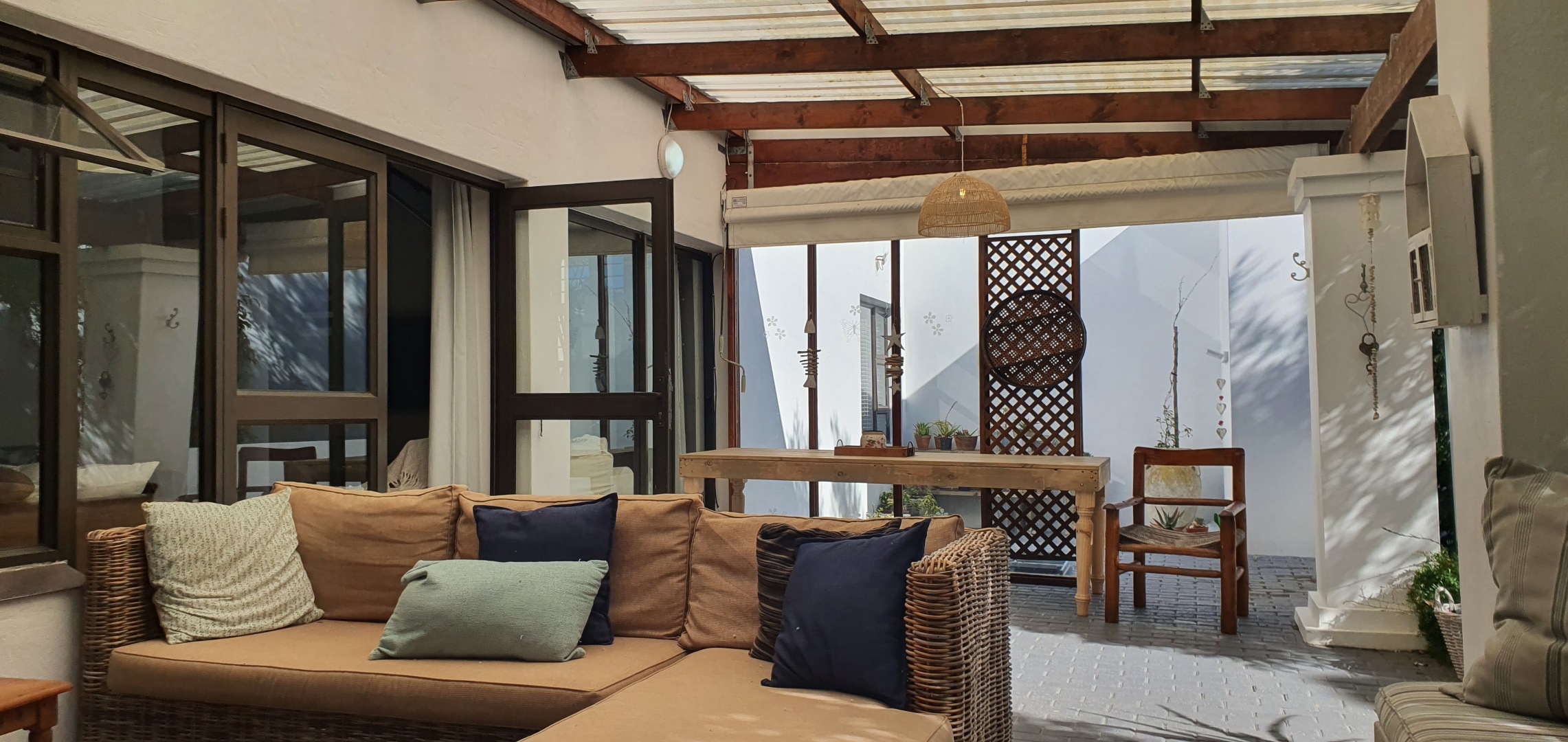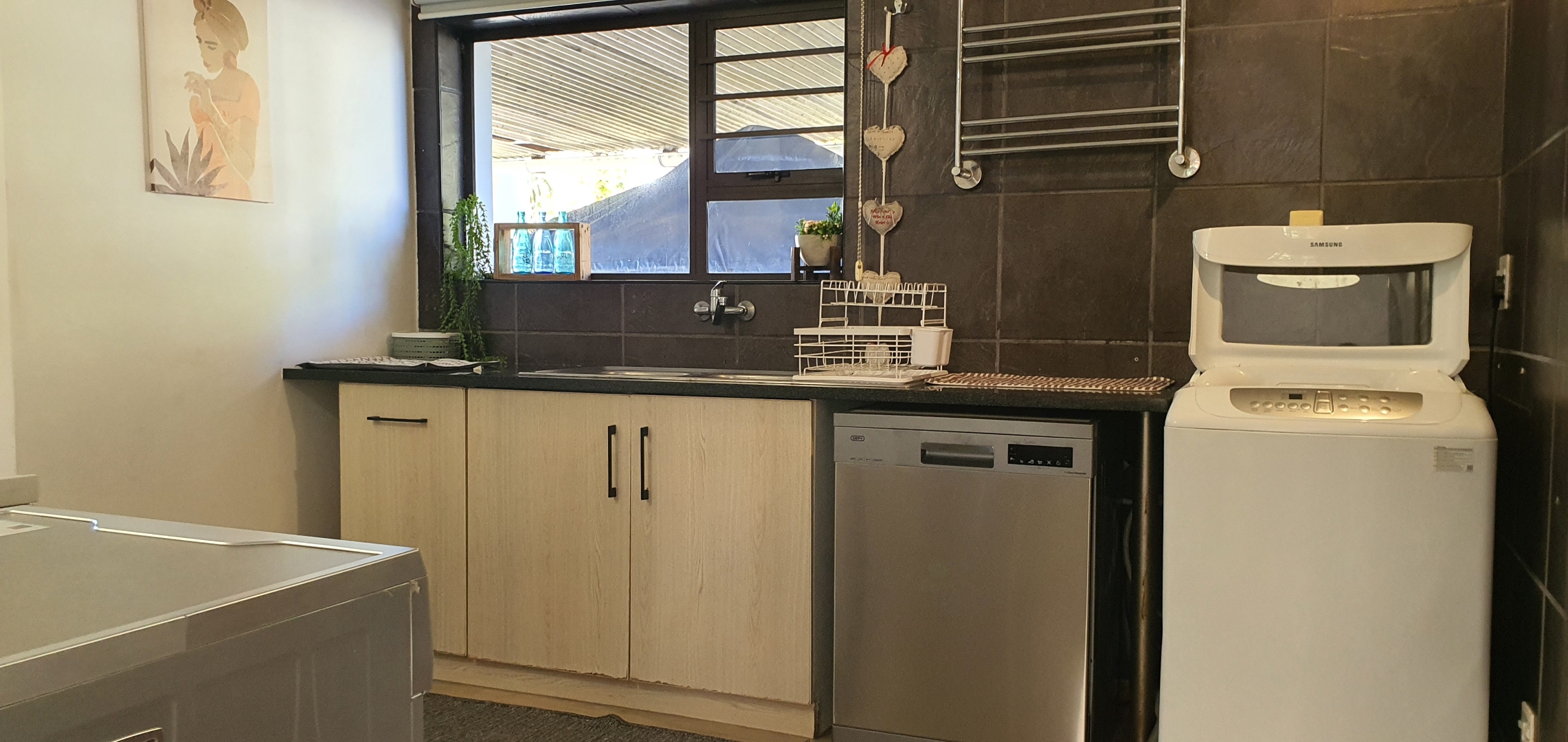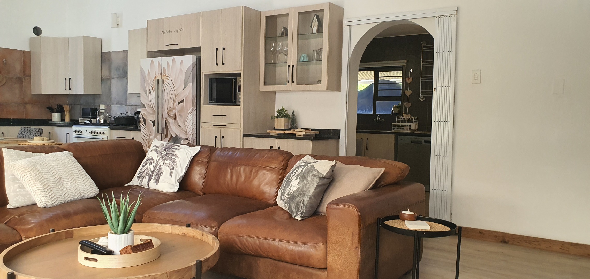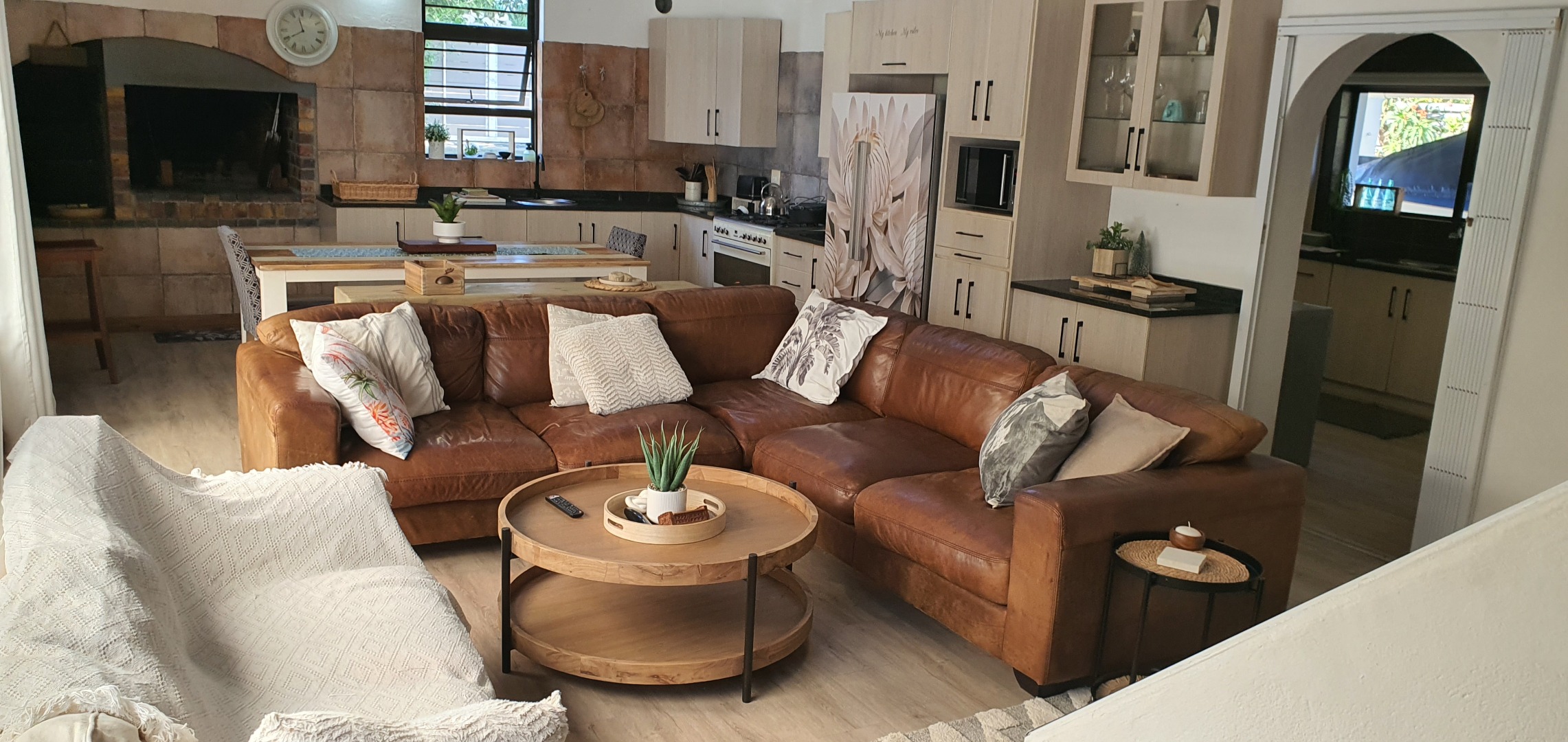 Spacious open-plan lounge, dining area, and kitchen with built-in braai