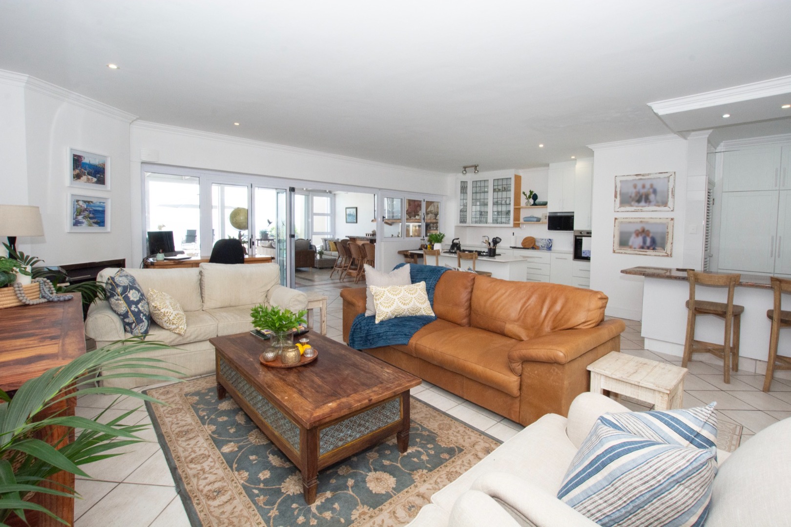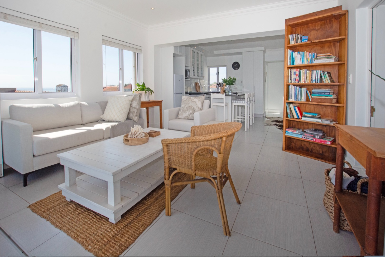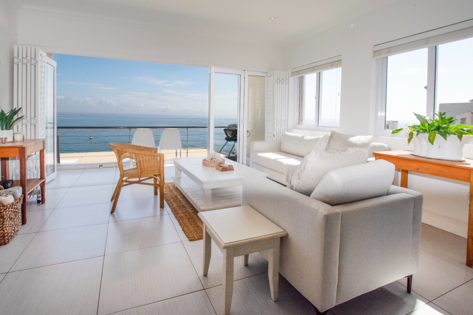 Level 2: A true entertainer’s haven, with an open-plan lounge and fireplace, designer kitchen, dining space, pantry, guest bathroom, and built-in braai. Slide open the glass doors to reveal the pool and terrace — where ocean breezes set the scene.