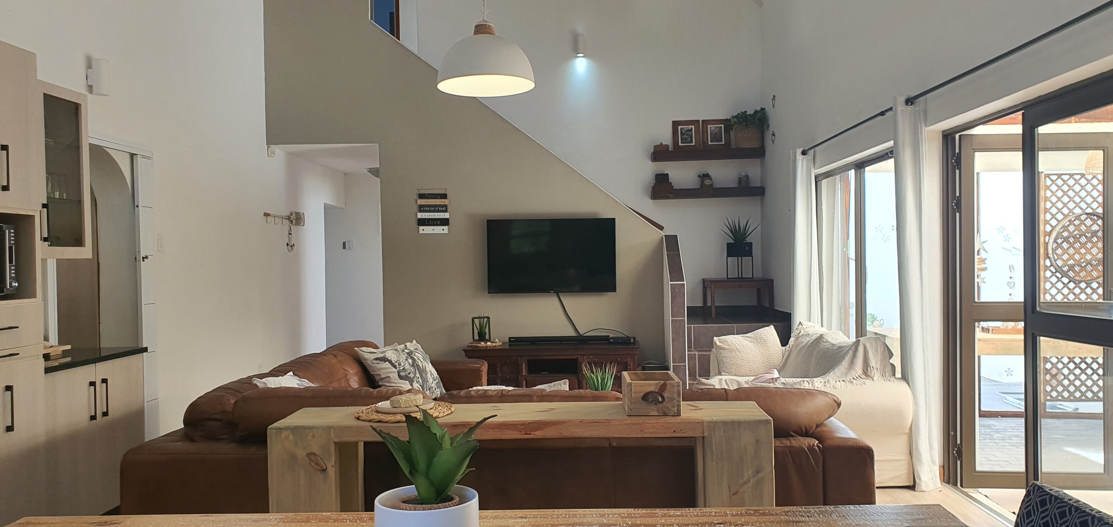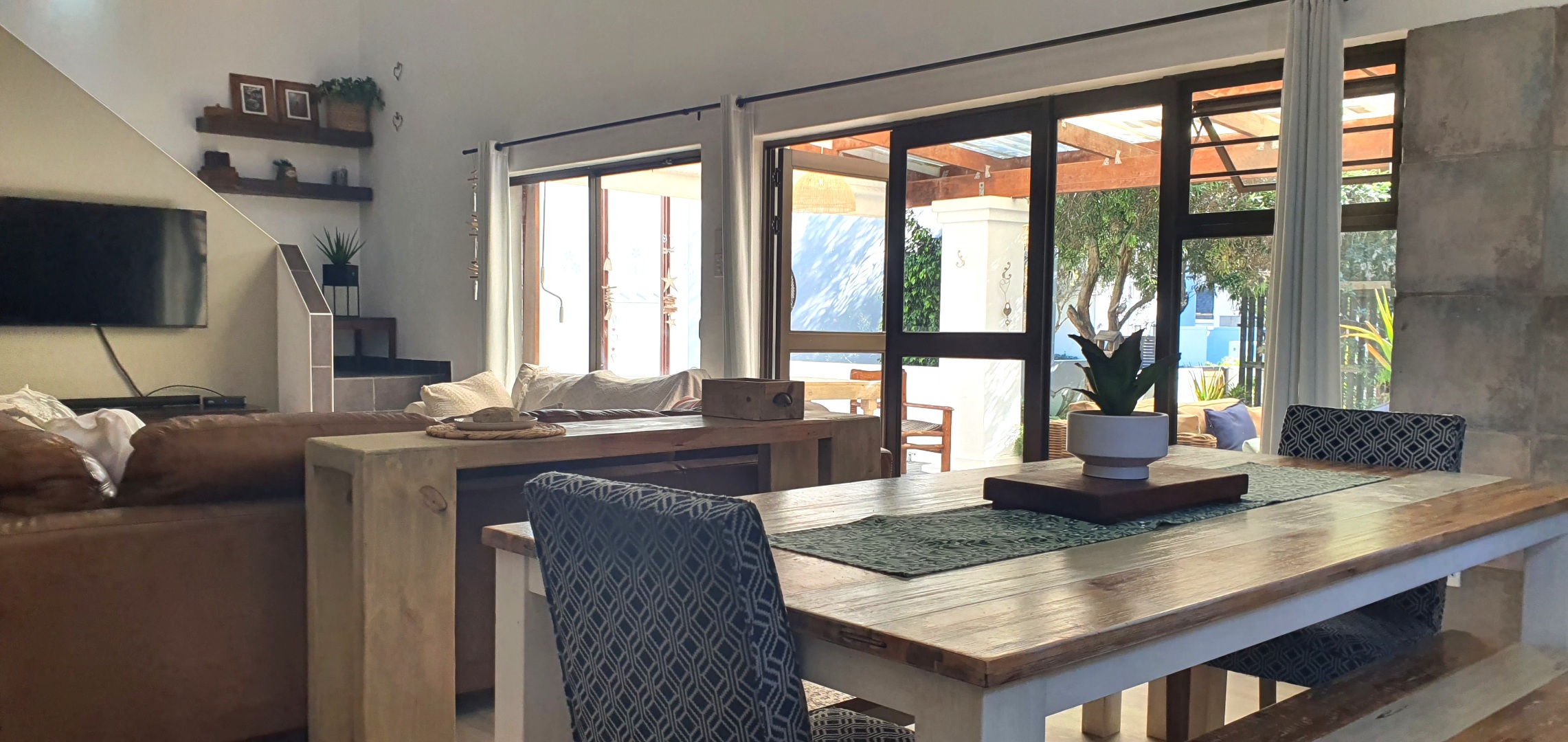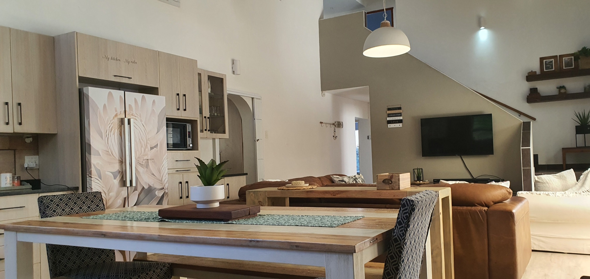 Spacious open-plan lounge, dining area, and kitchen with built-in braai
